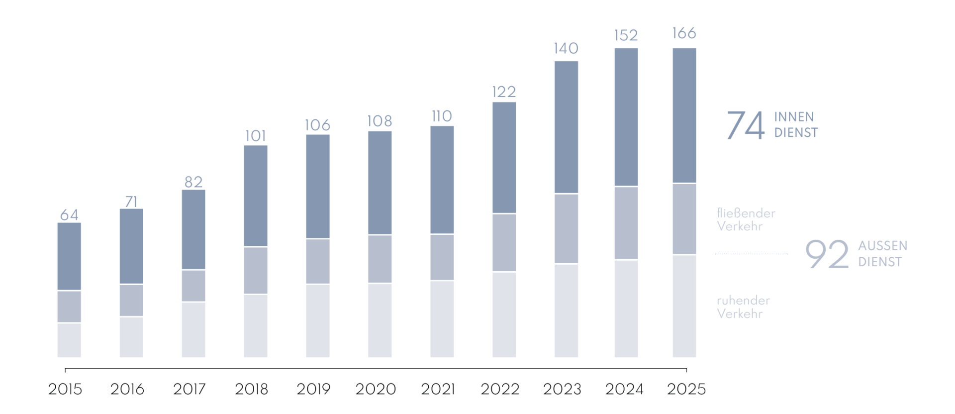 | Beschäftigte Mitarbeiter/innen im Innen- und Außendienst | 110 | 121 | 140 | 152 | 166 |