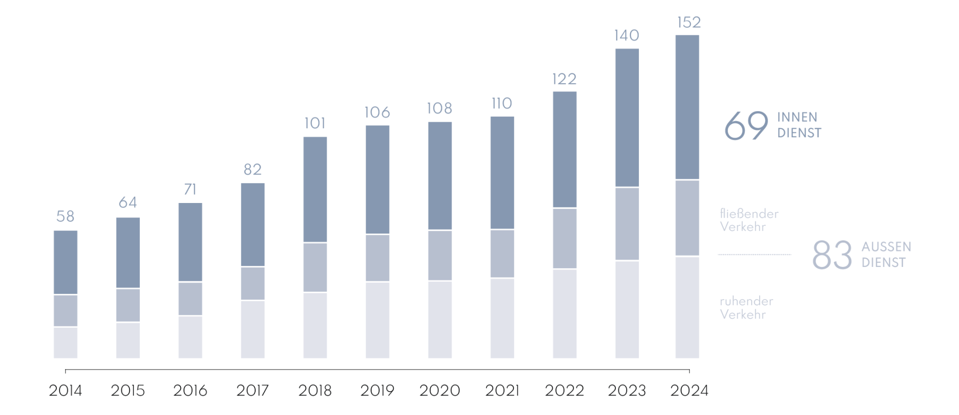 | Beschäftigte Mitarbeiter/innen im Innen- und Außendienst | 106 | 110 | 121 | 140 | 152 |